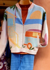 Palmen, Strand, Meer, Sonnenuntergang und VW-Bus! Wenn das nicht zu La Palma passt! Sixties-Feeling und die unbeschwerte Leichtigkeit des Seins sind hier in diese lässige Bomberjacke aus feinster Biobaumwolle eingebaut. Wir sind begeistert von dieser kreativen Kollektion!