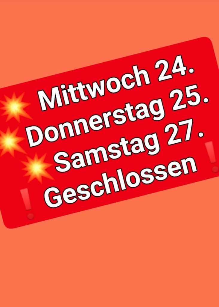 Die Weihnachtswoche sind wir noch Dienstag und Freitag Vormittag für euch da. Nächste Woche am 31. sind wir auch schon beim Anstoßen auf phänomenales neues Jahr! Aber sonst immer gerne mit Herzblut für euch da!